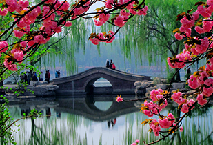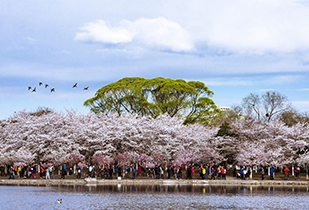 在水一方:园内目前体量较大的一株吉野类?;?,独立湖畔丰姿绰约。她横生的花枝舒展秀丽,像热情开张的臂膀。她与春水相映而成的画面,已成为公园樱花的代表景致,也成为游人争相合影的佳处。 详情>>